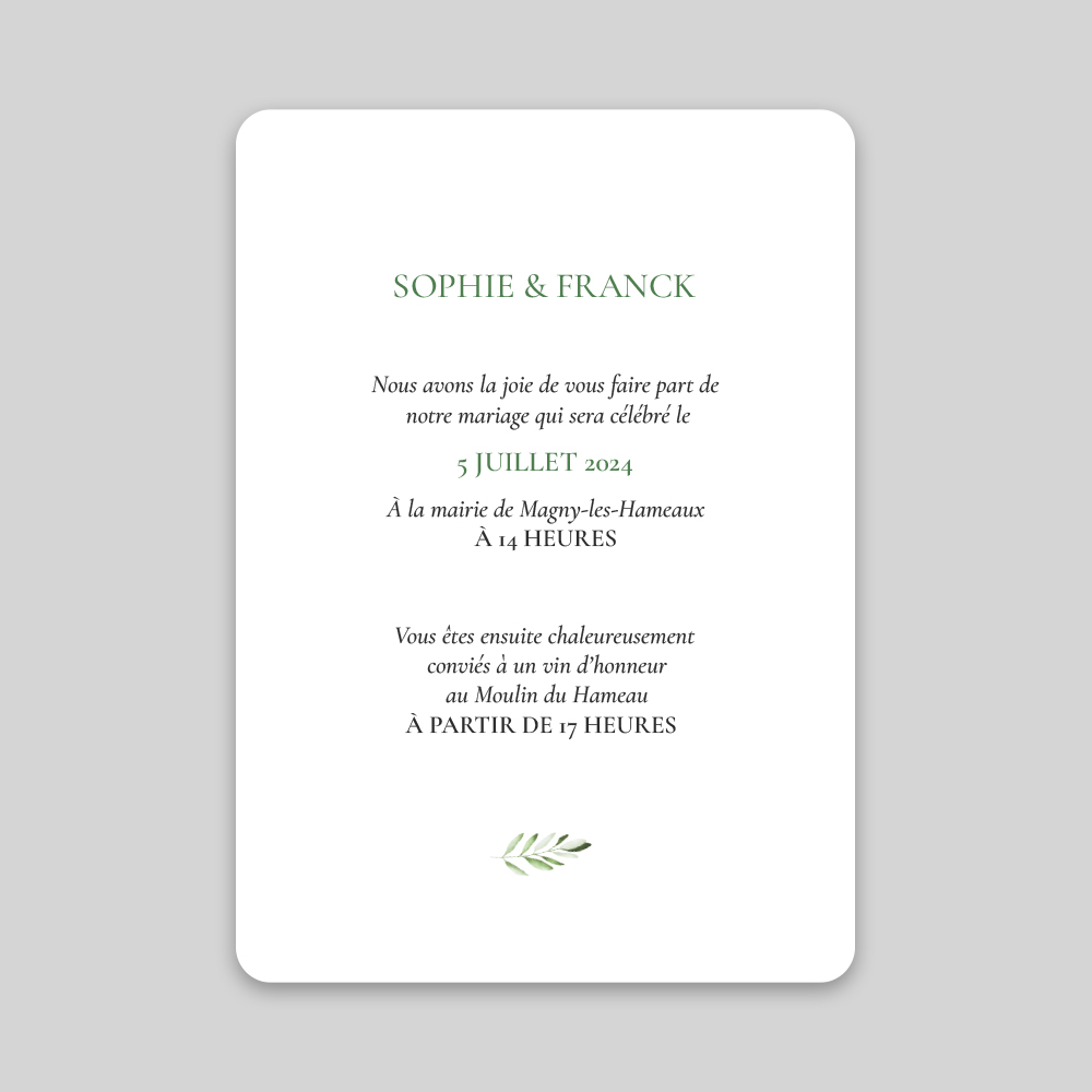 Le faire-part Branche d’olivier annoncera tout en douceur et raffinement votre mariage à vos proches.