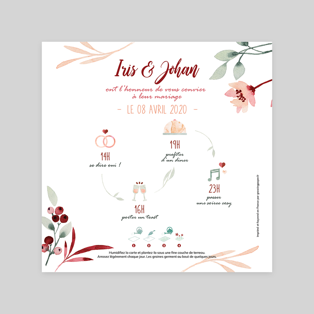 Ce faire-part est disponible sur le papier ensemencé artisanal, le papier tulipe et le papier recyclé.