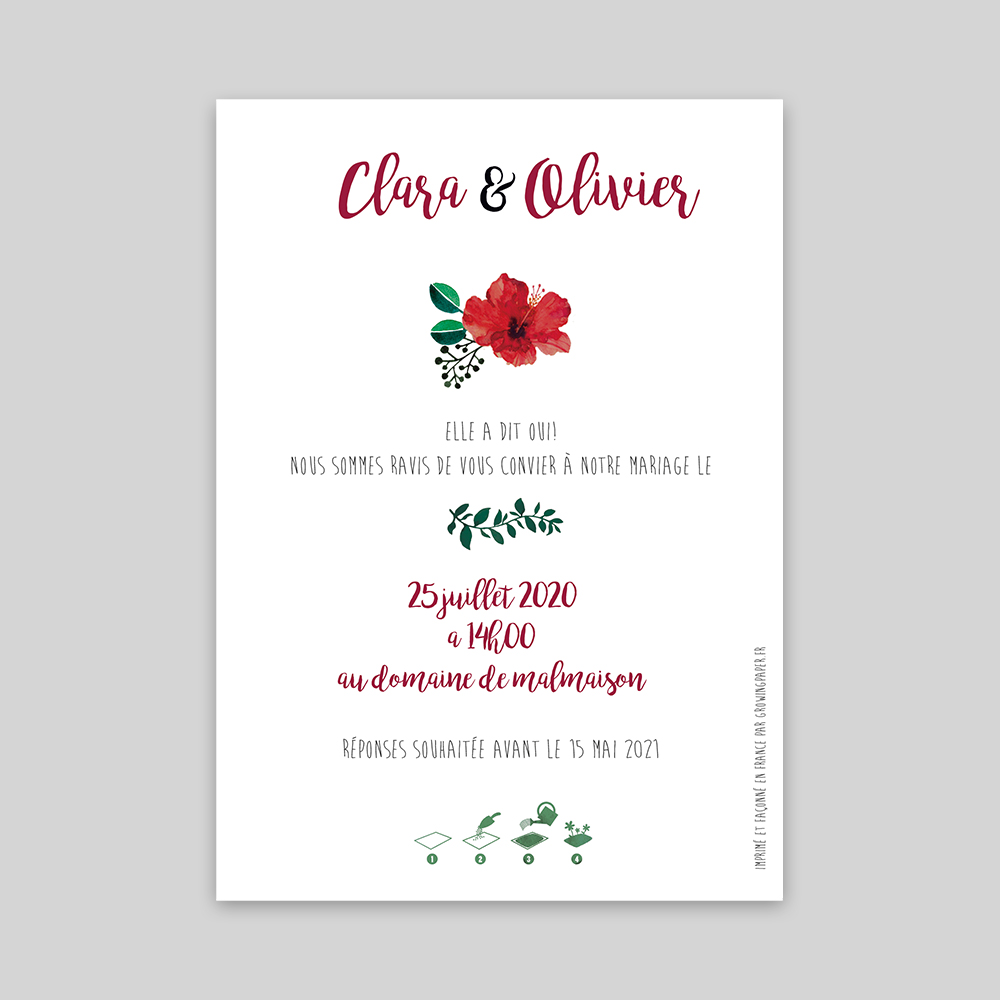 Ce faire-part est disponible sur le papier ensemencé artisanal, le papier tulipe et le papier recyclé.