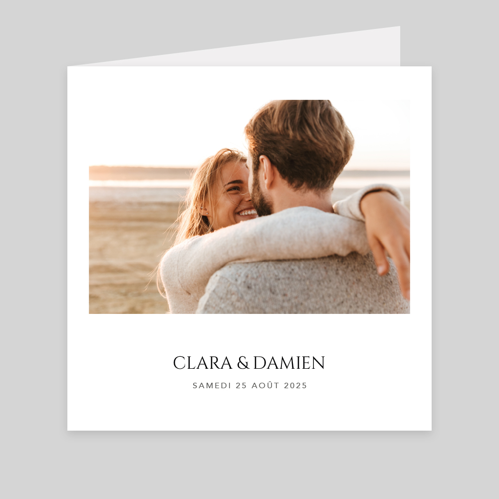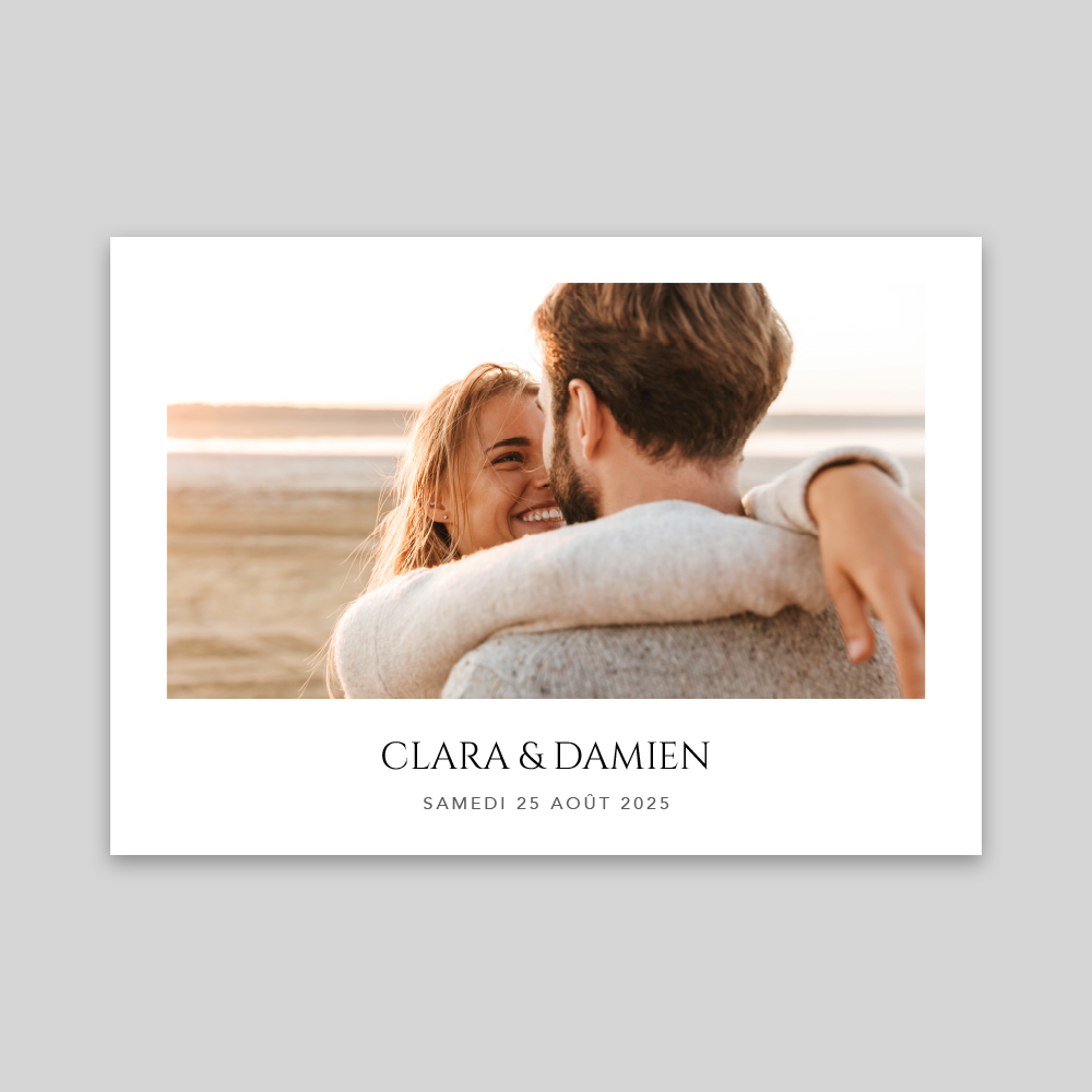 Choisissez le faire-part de mariage Intemporel pour annoncer la magnifique nouvelle de votre union. Choisissez la plus jolie photo de votre couple, vos invités ne pourront pas résister. Le recto laisse la place à votre photo et le verso vous permet de noter les informations concernant la cérémonie de votre mariage. Notre équipe se chargera de vérifier que tout est parfait pour l’impression.