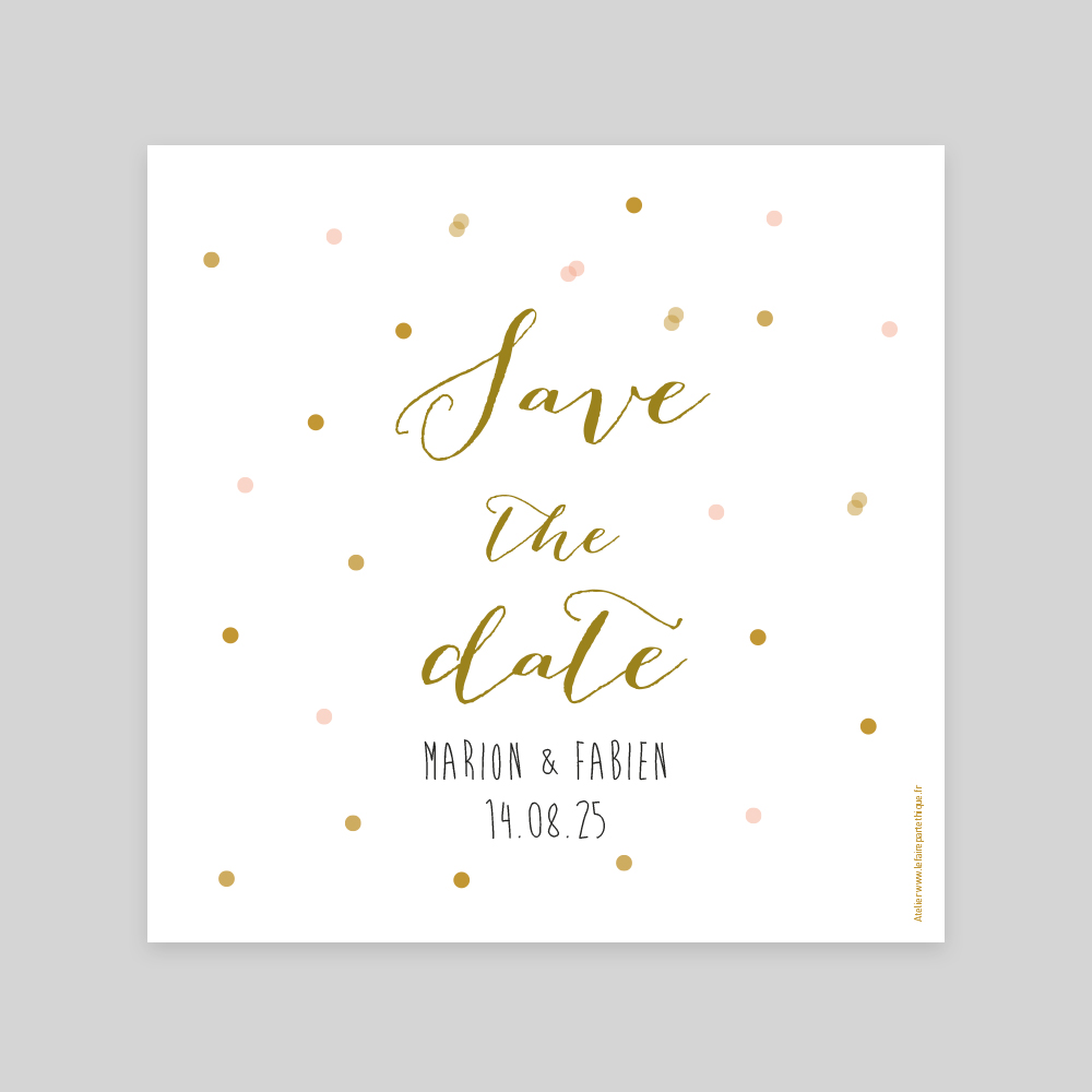 La date de votre mariage est fixée ? Vous souhaitez l’annoncer à vos convives ? Avec le Save the Date Oui, vous pourrez le partager à vos proches. Une typographie aux teintes dorées, quelques confettis qui présagent d’un merveilleux moment festif et élégant.